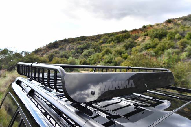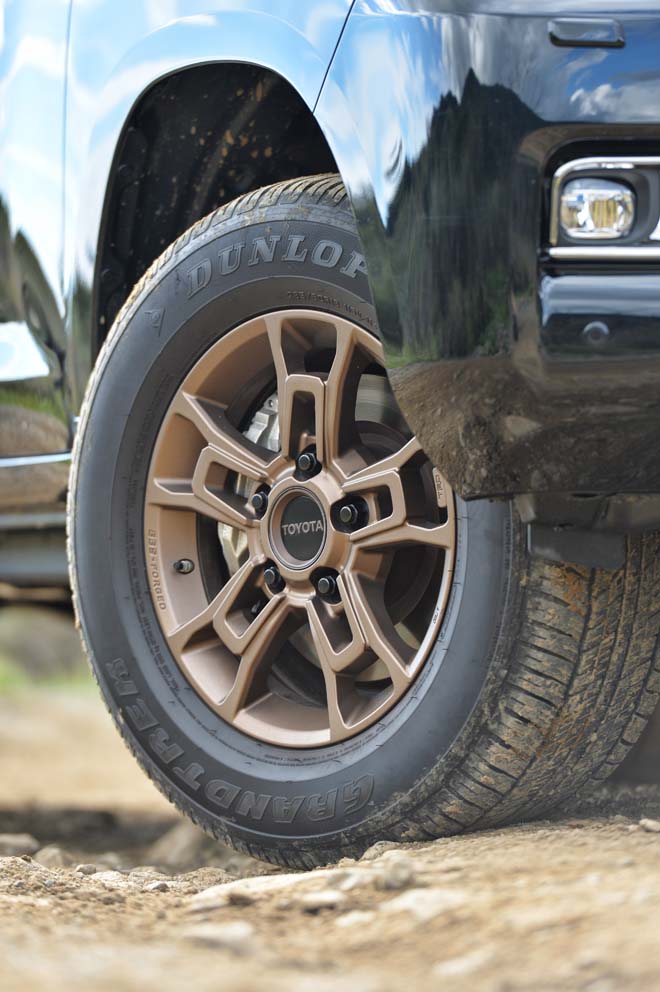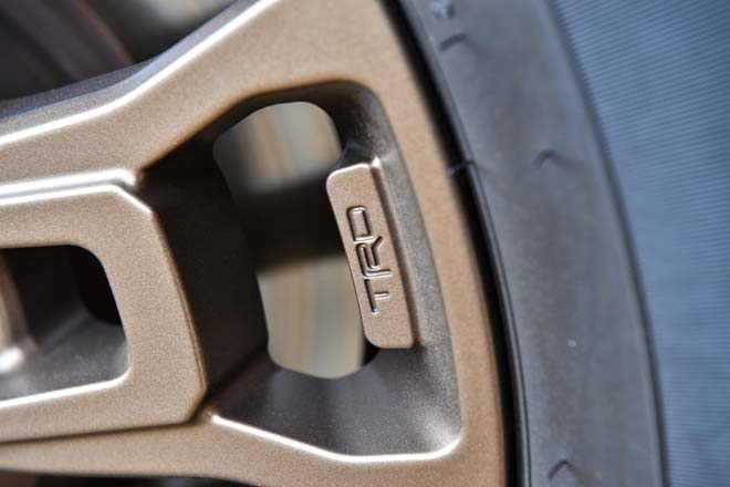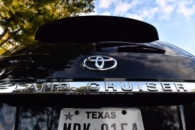 ベースグレードよりも2300ドルも高く設定された内容の違いは、外観に著しく現れている。ボディカラーはご覧のミッドナイト・ブラック・メタリックと、さらに425ドルを追加すればブリザードパール・ホワイトを選択することも可能だ。印象的なマットブロンズの18インチホイールは、BBSによるフォージド(鍛造)の逸品。よく見ればリムの一画にTRDのロゴが刻まれていた(ファンにとっては垂涎のアイテム。市場にはコピー品も出回っている )。ルーフレールにはYAKIMA(ヤキマ)製のラックを標準装備し、Dピラーに取り付けられたエンブレムはFJ40と共通するビンテージ風である。
