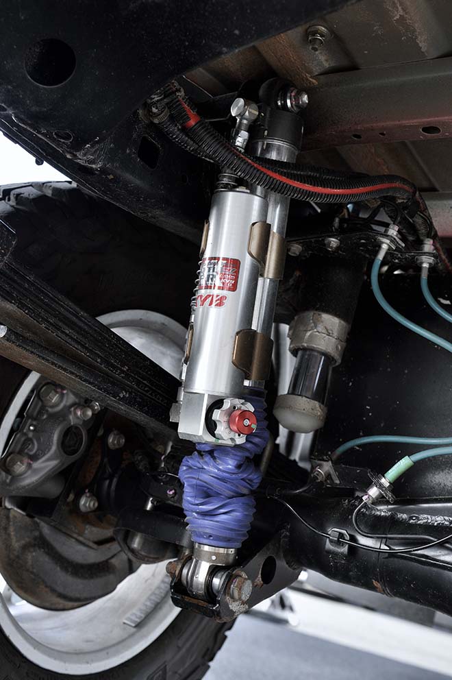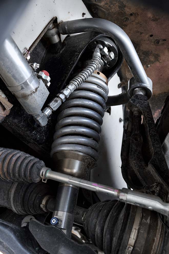 参戦5年で着実に進化を遂げてきたKYB共同開発のダンパー。前後にリザーバータンクを備えたラリー専用仕様で、伸/圧を個別に調整できる減衰ダイヤルが付く。ちなみにコイルやリーフはタイヤホイール同様、市販品だ。