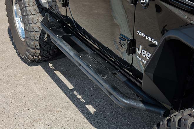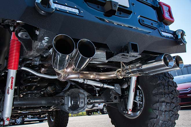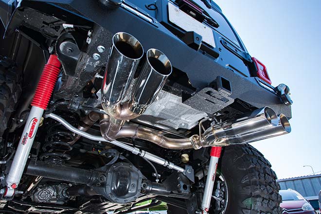 まず、目を引くのが17インチへとサイズダウンされたオールドスクールなミッキートンプソンに40インチのジオランダーX-MTを組み合わせていることだ。4.5インチのリフトアップを果たした足回りはランチョのサスペンションキットとJAOSのラテラレルロッドで支えられ圧倒的な存在感を放つ。エクステリアではラインXで塗装されたステルスフェンダーや前後バンパー、サイドステップを装着することでワイルドなイメージに。フロントバンパーではフープとウインチが絶妙なアクセントを添え、リアバンパーの下からはオリジナルで製作されたフルステンレス製の4本出しマフラーが顔を見せ、迫力のエキゾーストサウンドを響かせる。