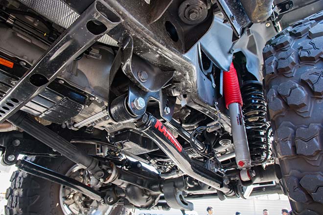 ランチョのサスペンションキットとアーム類を使い4.5インチのリフトアップを果たす。JLラングラーの右ハンドル仕様はパーツに特殊性があり加工が必要になることも多いという。