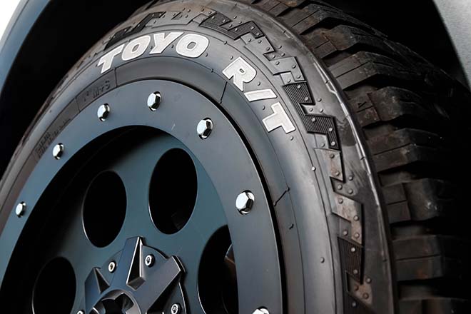 通好みなBLACK RHINOに225/65-17サイズのBFグッドリッチ、とUSブランド指向なノリも感じる足元は収まり具合も絶妙。