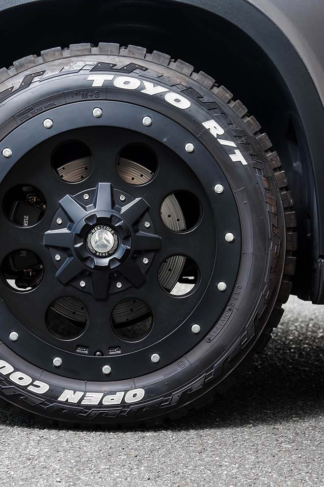 こちらもSOLID製リムにアメリカで人気のTOYOと足元のセンスはUS向き。センターキャップにはベンツを残すことで品格を保つ。