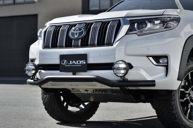 そのスタイルは、ひと目でジャオスと判るスキッドバーに代表されるお馴染みのオフ系だ。車種によっては樹脂などでそれ風に魅せる場合もあるなかで、リアルにステンレスやスチールを使用。単なるファッションパーツに終始することなく、例えばサイドであれば実際に足を掛けて乗り降り可能と、実用性にも配慮したタフネス仕様であるなど、本格四駆ユーザーも納得の出来。しかもそれらの取り付けはすべて無加工と、直接的な加工を嫌うユーザーが根強い中で、ボディへ負担をかけずに見た目と実用性を同時に手にできる。