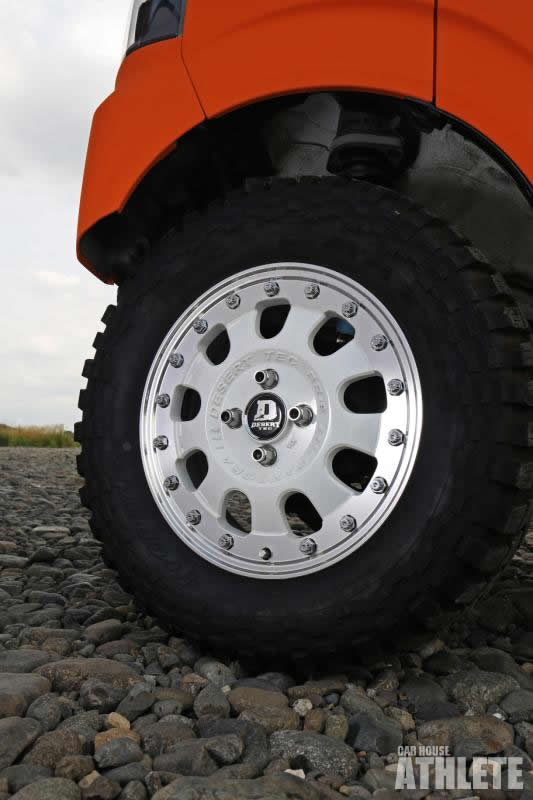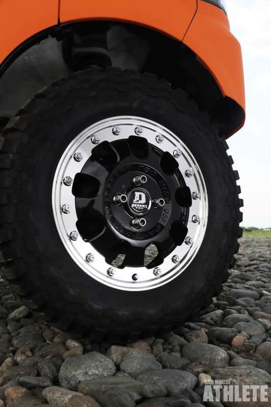 15インチへとサイズアップされたパンドラ製ホイール デザートテックが力強い走りを彷彿させている。M/Tタイヤを装着することで、軽商用車に悪路に対する走破性の高さをもたらした。