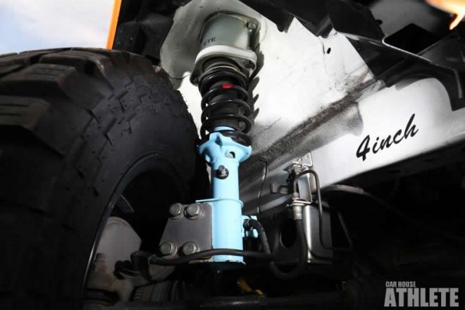 丸見えとなっているデフが印象的で、4インチリフトアップはハーフバンパーと相まって効果以上のビジュアルチューンとなっている。ノーマルショックをチューンナップしていることでコストダウンにも前向きだ。リフトアップすることでステアリング感覚に変化が生まれてしまうが、補正プレートを用いることで対処している。