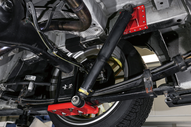 駆動輪になるリアはダンパーの取り付け角も補正済み。もちろんLSDもセットすることで、コーナーリング時に起こる左右輪の駆動ロスも緩和している。基本的には大きな変更は与えられていないため、現状では足回りに関しては従来からある最適な作りをトレースすることで踏めるハイエースが完成するというわけだ。