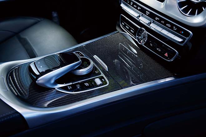 フロントにはAMG純正となるバンパーガードを装着してオフローダーらしいアグレッシブなフロントマスクを実現。ヘッドライト、グリル、ウインカー、ドアミラーウインカー、テールランプなどにスモークタイプを装着し精悍なルックスに仕立てられている。これらは全て純正品なのでフィッティングはもちろん、品質の面でも安心して使用できる。インテリアにはカーボンパーツを豊富に使うことで、スポーティで上質なAMGらしい室内をさらに格上げする。