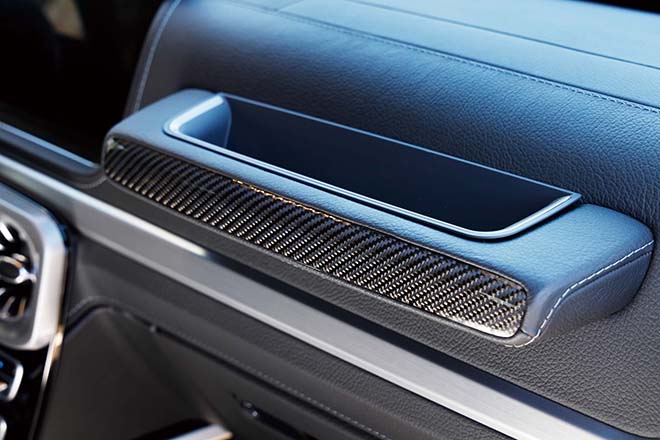 センターコンソールやタッチパッド周囲もカーボンインテリアに変更。助手席のアシストグリップのすき間にはめるだけの小物入れ。