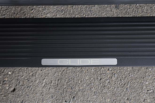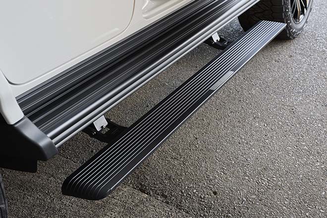 ステップ部分にロゴが入るGLIDEオリジナルの電動サイドステップ。ドアを開けると自動的にステップが出てくるので、乗降時の実用性を高める重要な役割を持つ。後席までカバーするロングタイプであるほか、格納時も非常にスマート。
