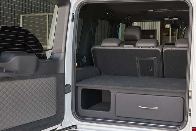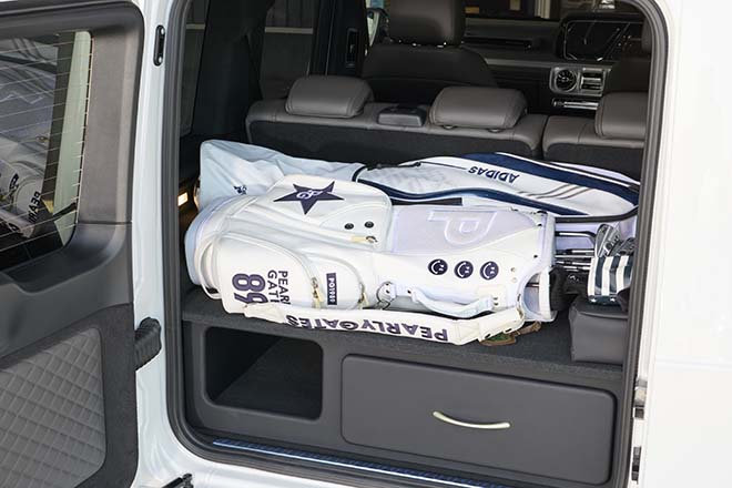 シルバーの加飾部分をブラックにして、エレガントなモノトーンスタイルを作り上げている。バンパーの樹脂部分をグロスブラックにすることで、純正とはひと味違う質感の高さを演出。ラゲッジルームに備わるドロワーは、GLIDEのオリジナル。上段にフラットなスペースが作れるため、ゴルフバッグなどを横積みできるほど使いやすい。下段は引き出しタイプと蓋なしの収納スペースとなっている。