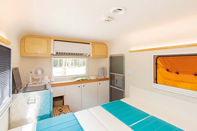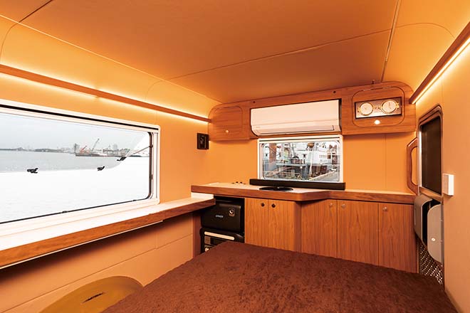 キャビン内は豪華客船のようなゴージャスな作り。ワクワクしながら中に入ってみると、見た目以上にゆったりできる空間となっているのだ。モデルによってキャビン内のイメージが異なるのも面白い。エアコンや水回り、キッチンまで完備しているので季節を気にすることなく、トレーラーライフを満喫できる。テーブルを収納してからのベッドへのアレンジも簡単にできるのも好印象で極上のひとときを過ごせる。